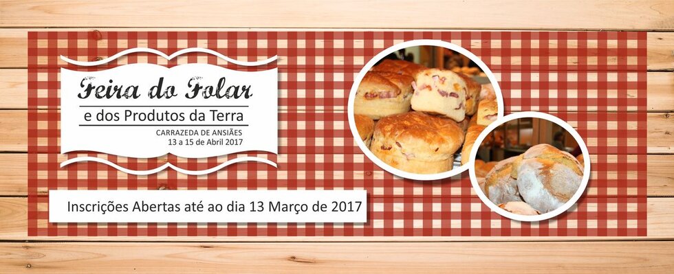 O Municipio de Carrazeda de Ansiães informa que estão abertas, até ao dia 13 de Março, as inscrições para a Feira do Folar e dos Produtos da Terra. Nesta feira que irá decorrer entre 13 e 15 de Abril, no Centro de Apoio Empresarial de Carrazeda de Ansiães, poderão participar todos os expositores cuja atividade esteja afeta à panificação, pastelaria, compotas, enchidos e outros produtos agrícolas.