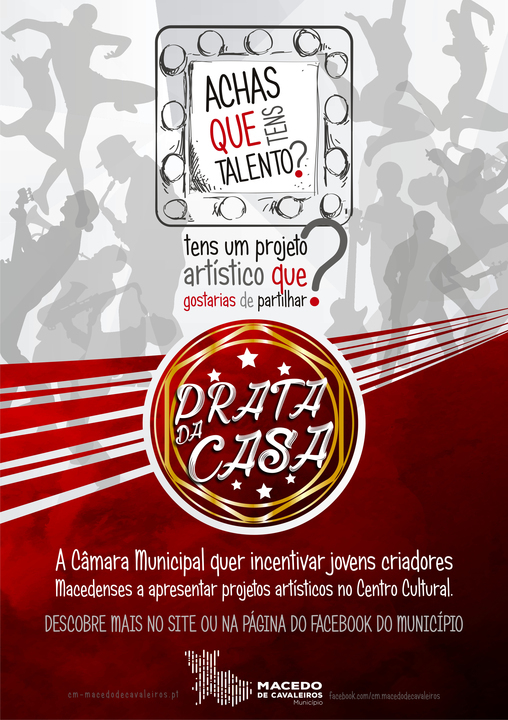 O projeto “Prata da Casa”, promovido pela Câmara Municipal de Macedo de Cavaleiros, propõe-se incentivar jovens criadores Macedenses na apresentação de projetos artísticos no Centro Cultural, dando apoio na produção dos projetos selecionados, através de acompanhamento técnico e logístico. Os projetos artísticos a apoiar poderão ser desenvolvidos nas seguintes áreas: música (em todos os seus géneros), performance, teatro, vídeo e cinema.