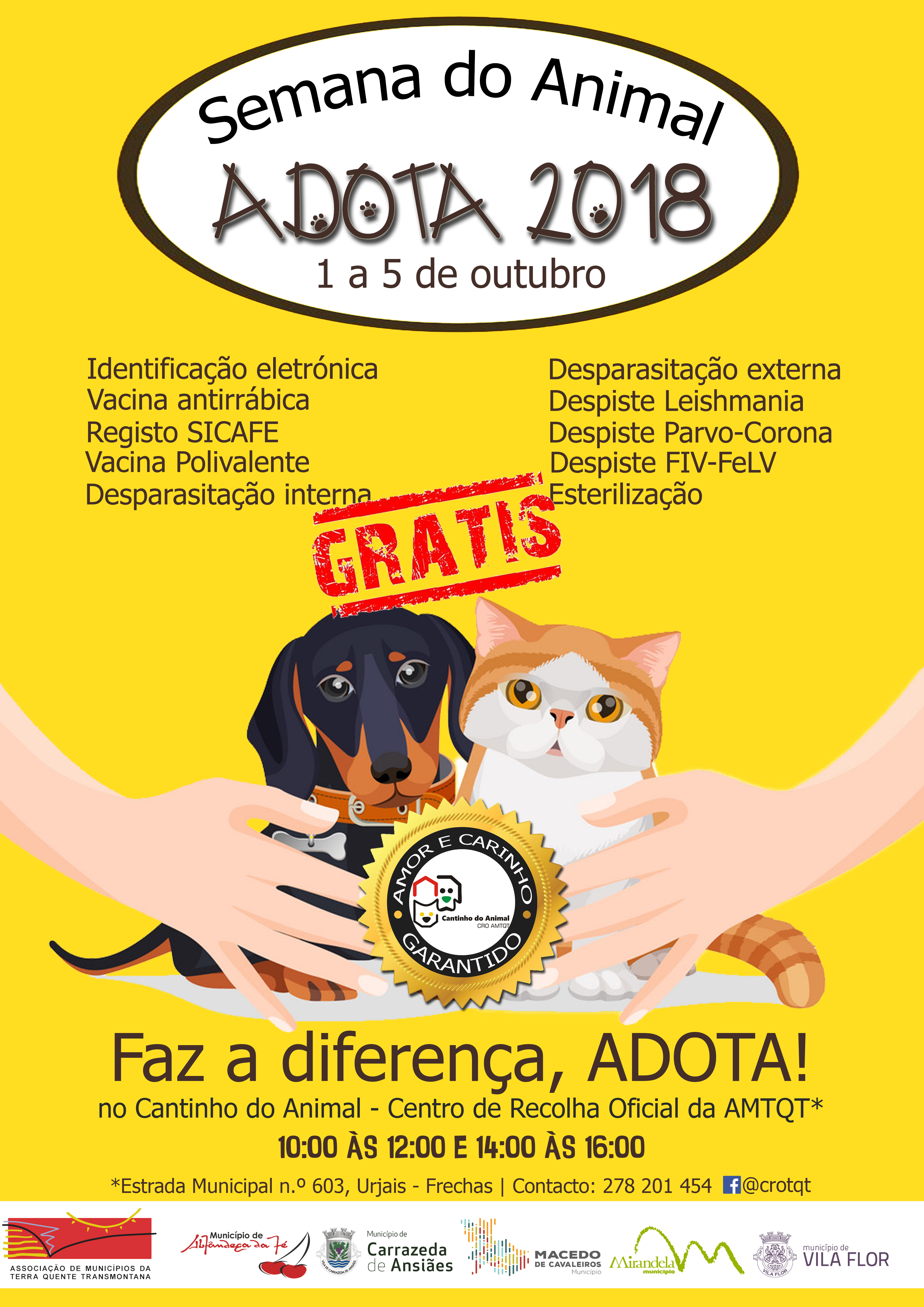 Durante a Semana do Animal “Adota 2018” todos terão a oportunidade de adotar um animal vacinado, desparasitado, esterilizado, identificado e registado, gratuitamente. Uma oportunidade única para adotar, responsavelmente, o novo membro da sua família que irá encher a sua vida com amor e carinho garantido.