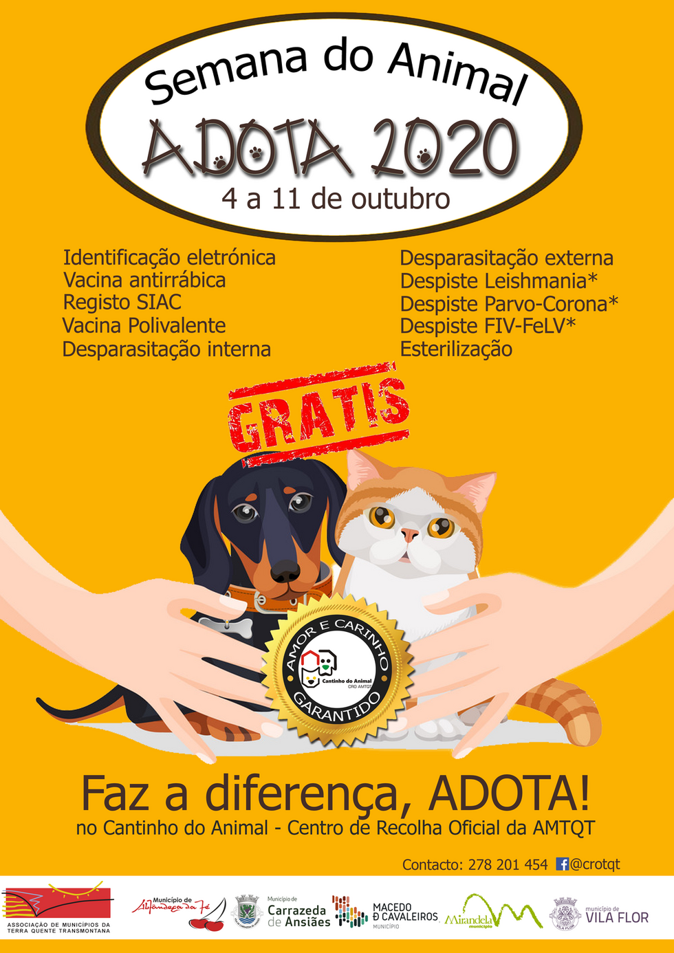 No âmbito do Dia Mundial do Animal que se celebra anualmente a 4 de outubro, a Associação de Municípios da Terra Quente Transmontana promove mais uma Semana do Animal, entre os dias 4 a 11 de outubro de 2020, com o objetivo de sensibilizar a população para a importância dos direitos e bem-estar dos animais de companhia.