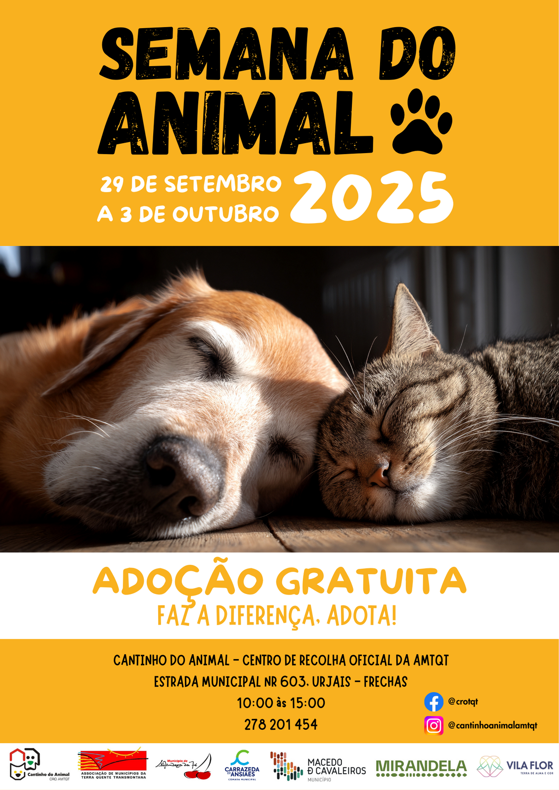 De 29 de setembro a 3 de outubro de 2025, o Cantinho do Animal – Centro de Recolha Oficial da AMTQT, em Urjais (Freguesia de Frechas), promove a Semana do Animal, uma iniciativa dedicada à promoção da adoção responsável e à sensibilização da comunidade para o bem-estar animal.