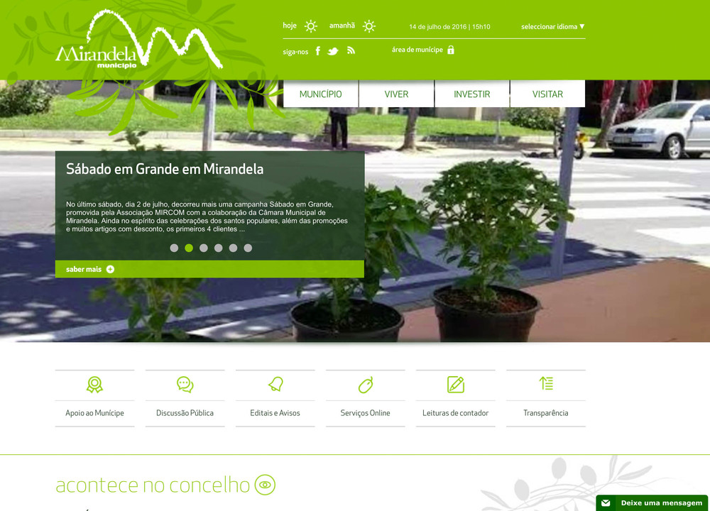 No portal web institucional (www.cm-mirandela.pt) poderá encontrar toda a informação relativa ao Município, bem como dados úteis para quem vive e desenvolve a sua atividade económica no concelho de Mirandela, bem como aceder à área de serviços digitais do munícipe, onde pode consultar eventuais processos urbanísticos, alterar dados pessoais e consultar informações relativas ao seu consumo de abastecimento de água, entre outras.